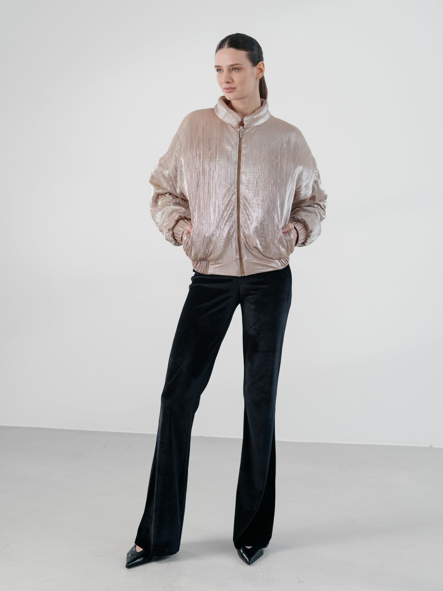 Sacou bomber din lycra, culoare auriu, stilat și confortabil, cu croială lejeră, ideal pentru ținute casual-chic sau pentru un look de seară îndrăzneț.
