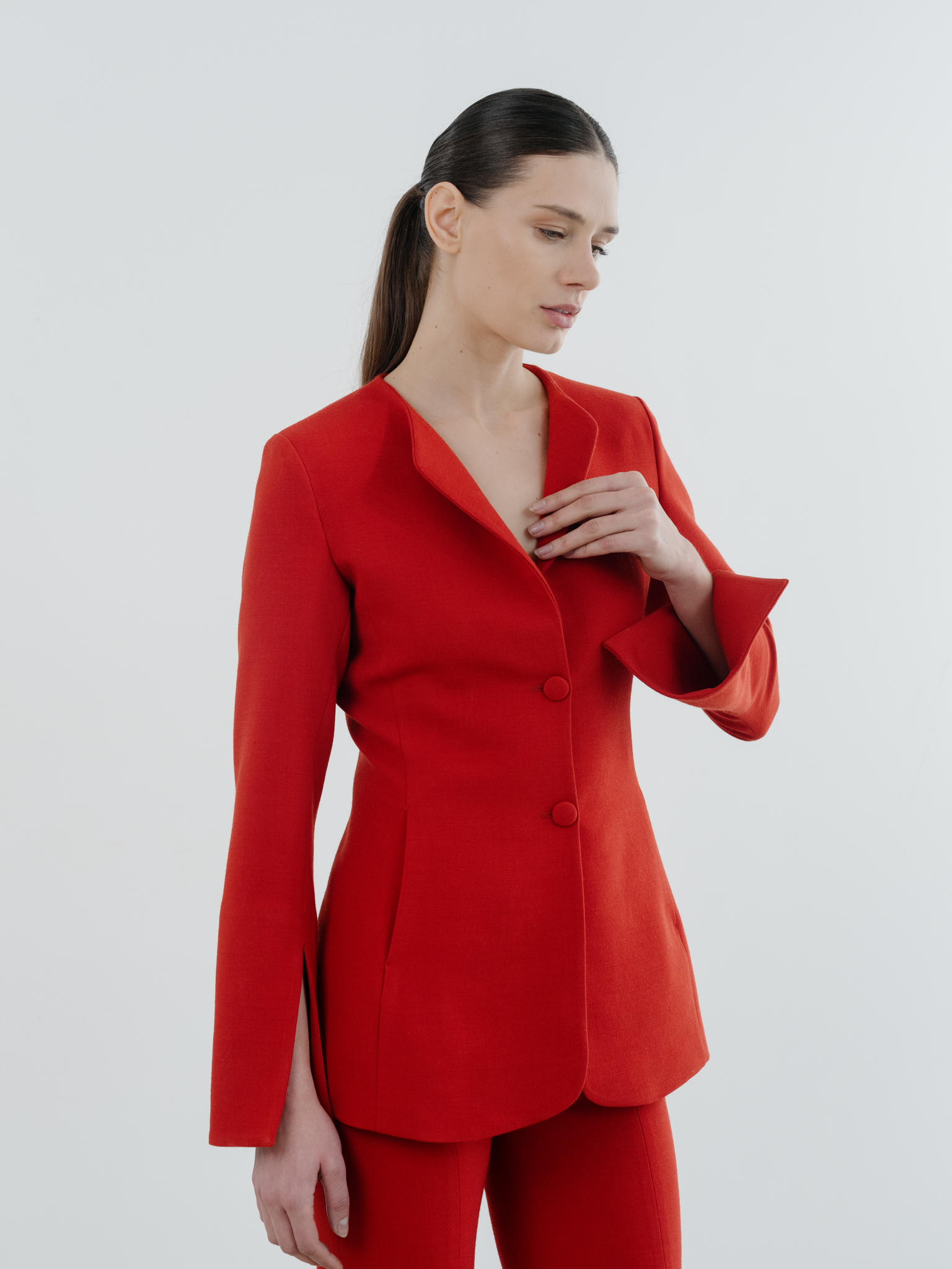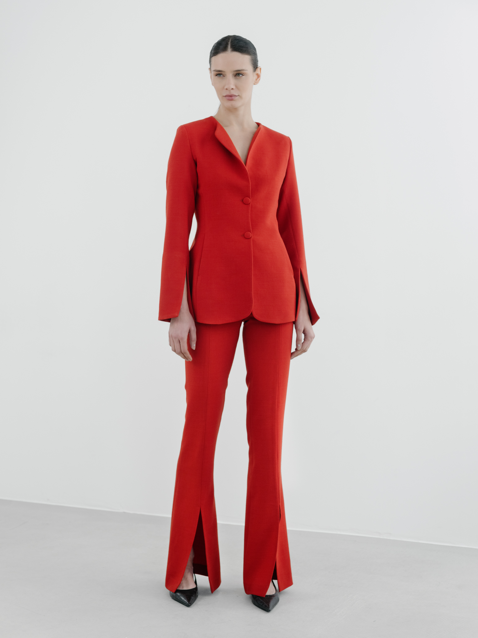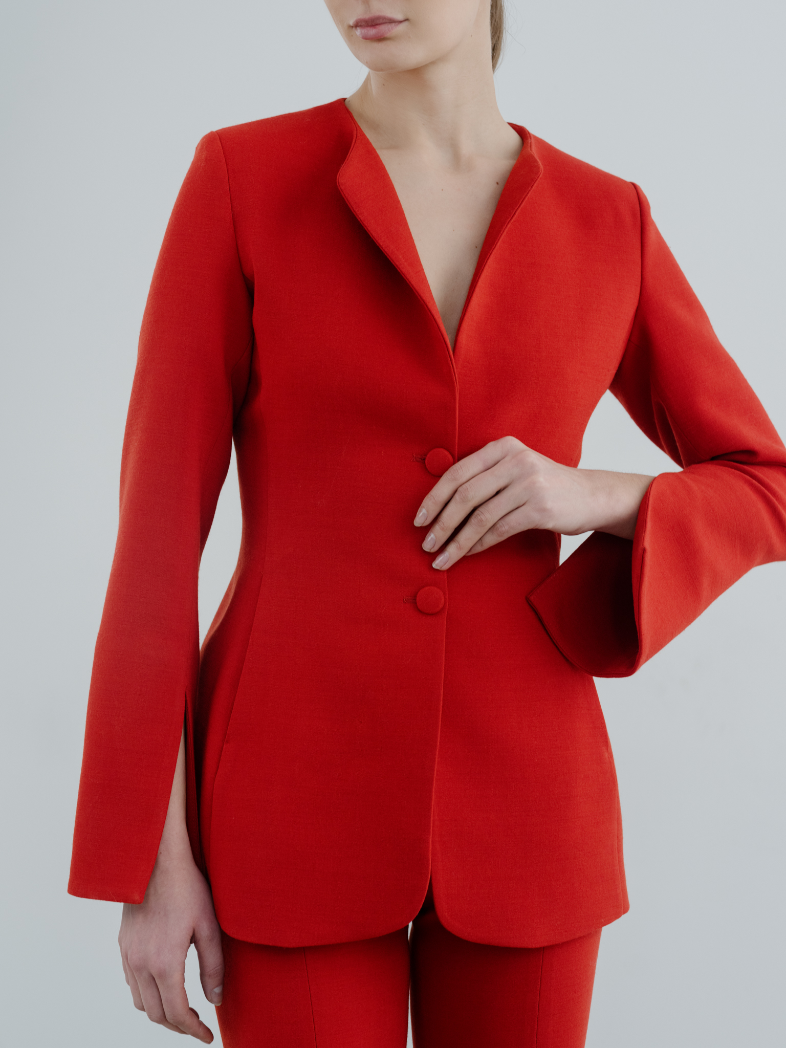 Sacou realizat din stofă elastică 100% lână, cu țesătură dublă față care dezvăluie subtil culoarea interioară, oferind un efect rafinat de contrast. Croiul cu clini accentuează linia siluetei, iar detaliile de design sunt evidențiate de nuanța interioară vizibilă în mișcare. Un model modern, sofisticat, care îmbină eleganța clasică a lânii cu accente contemporane.
